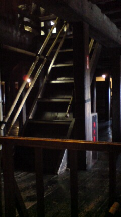 暗くてわかりにくいですが、これは階段です。流石にお城の中なので、上下の移動は全部階段。しかしこれがまた急なんですよね。急だし、足を置く面の奥行きが狭いし、奥行きの幅が一定じゃないし、鴨居は低いし。今は滑り止めを貼ってくれてるおかげでなんとか上り下りできますが、昔は袴はいて手すりもなしで上り下りしてたんですよねえ。うっかり転げ落ちる人とかいなかったんでしょうか。わざと上りにくく作ってあるところなんて、段の間が40cmくらいあるそうですよ!ほとんど梯子ですね……。