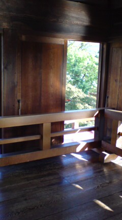 この窓ではないのですが、武者窓というのがあって、これが格子戸を二重にして、開けてそこから物見をして、射かけられたら閉める(格子の幅が10cmくらいなのですぐ閉められる)ものなのですが、これを自由に開け閉めできるようになってます。他にも開け閉めできる窓が沢山あって……というより引き戸タイプの窓のほとんど全部を自由に開け閉めできるようになってて、いいのか国宝がそれで!とか思っちゃいました。でも武者窓とか面白いから、小学生とかが何回も開け閉めしてて、まあ確かに理屈で云々されるより一回開け閉めする方がよく分かるので、非常にありがたいといえばそうなのですが。