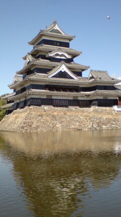 いやでも、この上の松本城を見れば分かる通り、写真撮るの下手です。携帯だからというよりは、私がへたっぴなのです。これも、なんだか斜めになってる上に、屋根のシャチホコが切れた……(;_;)